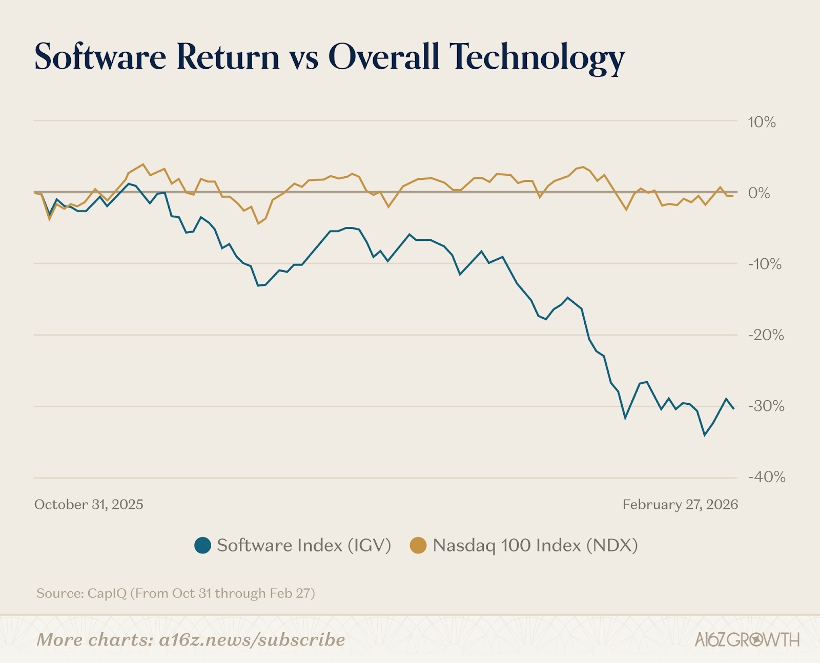 软件行业正在经历一场“恐慌发作”。自2026年初以来,上市软件公司的 ETF 已下跌 30%,抹去了自 ChatGPT 发布以来的所有涨幅。像 Salesforce、Adobe、Intuit、ServiceNow 和 Veeva 这些在十年或更长时间里持续为投资者带来资本增值的行业风向标,在短短几周内就下跌了 25% 到 30%。那些疯传的 Substack 文章设想了一个企业软件客户群被掏空、标普指数陷入多年大规模回撤的世界。人们称之为“SaaS 末日”(SaaSpocalypse)。这已迅速成为市场共识:AI 将终结软件行业。