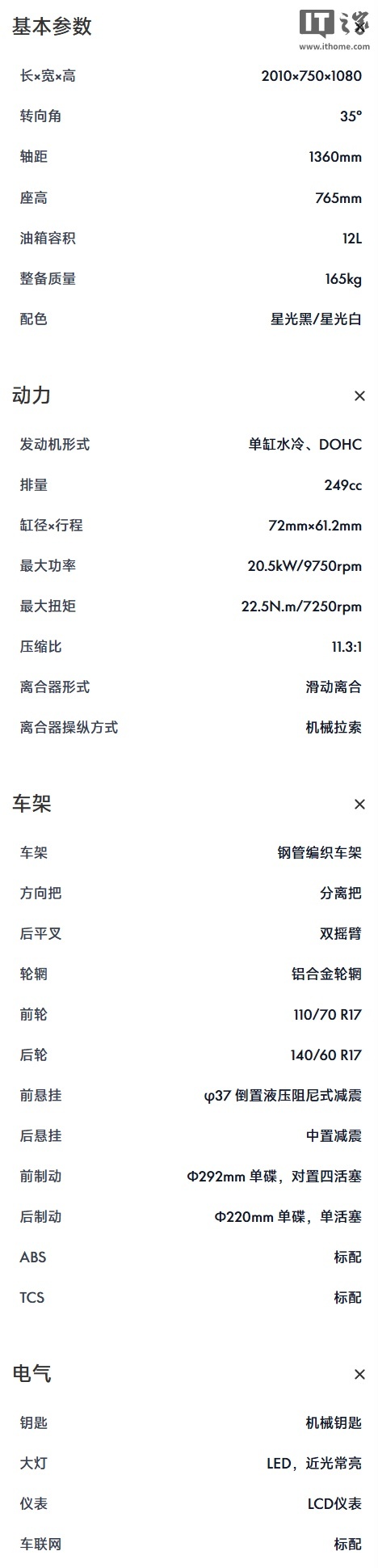 该车搭载 249cc 单缸水冷发动机,峰值功率 20.5kW,峰值扭矩 22N·m,整备质量 165kg。